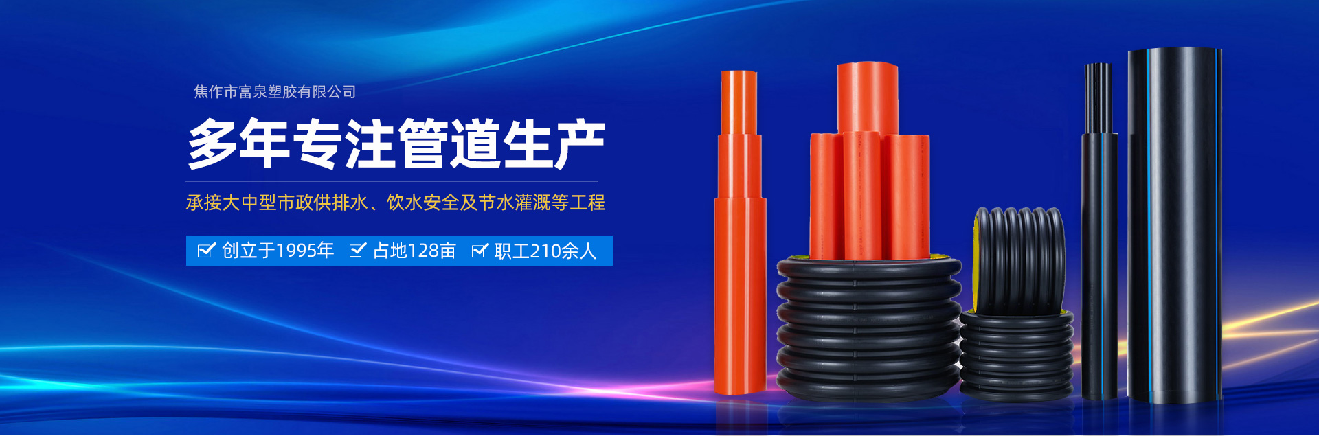 焦作市富泉塑膠有限公司,創(chuàng)立于1995年,是一家集研發(fā)、設(shè)計、生產(chǎn)、銷售為一體的大型管材企業(yè)。公司位于太極故里、黃河之濱一一河南焦作溫縣。公司占地128畝,現(xiàn)有職工210余人,其中具有中技術(shù)職稱的19人。生產(chǎn)、檢驗設(shè)備58臺(套),包括PVC實壁管生產(chǎn)線11套、PE實壁管生產(chǎn)線12套、HDPE雙壁波紋管生產(chǎn)線6套、PVC雙壁波紋管生產(chǎn)線5套,檢驗設(shè)備14臺(套)。主要產(chǎn)品有:Φ20mm-630mm、各種壓力規(guī)格的PVCU、PVC-M、PE給水管材,PVC-U節(jié)水灌溉管材,HDPE燃?xì)夂偷V用管材,DN200-800mm的HDPE、PVC雙壁波紋管及各種噴灌、滴灌工程材料。承接大中型市政供排水、飲水安全及節(jié)水灌溉等工程。  富泉塑膠公司重視產(chǎn)品的質(zhì)量、安全、環(huán)保和節(jié)能,在同行業(yè)中率先完成了“新華節(jié)水產(chǎn)品認(rèn)證”,全方面通過ISO9001:2008國際質(zhì)量管理體系、IS014001:2004環(huán)境管理體系和OHSAS18001職業(yè)健康安全管理體系的一體化導(dǎo)入,并建立起規(guī)范的現(xiàn)代企業(yè)管理體系。公司以“質(zhì)量”為先導(dǎo),采用質(zhì)量跟蹤、多環(huán)節(jié)把關(guān)的方法,組建具有行業(yè)水準(zhǔn)的企業(yè)技術(shù)檢測中心,常年委托水利部節(jié)水灌溉設(shè)備檢測中心、河南省產(chǎn)品質(zhì)量監(jiān)督檢驗院對產(chǎn)品跟蹤檢測,并由中國人民保險公司承保產(chǎn)品質(zhì)量。公司連續(xù)多年被河南省水利廳確定為“安全飲水設(shè)備、節(jié)水灌溉設(shè)備”定點(diǎn)生產(chǎn)企業(yè),并獲得“中國名優(yōu)產(chǎn)品”“質(zhì)量、服務(wù)、信譽(yù)AAA企業(yè)”“河南省**產(chǎn)品”“河南省水利企業(yè)”“河南省守合同、重信用企業(yè)”等榮譽(yù)稱號。  富泉塑膠公司堅持“用戶為上”的服務(wù)理念,長期以來,全方面關(guān)注客戶價值,不斷提升服務(wù)水平。服務(wù)隊伍常年為客戶的產(chǎn)品設(shè)計、施工、安裝提供合理的方案和全程細(xì)致、周到、**、快捷的技術(shù)服務(wù)。公司自成立以來,一直堅持以人為本的宗旨,塑造企業(yè)形象,并致力于新產(chǎn)品的開發(fā),憑借雄厚的技術(shù)開發(fā)能力,先進(jìn)的工藝制造流程,嚴(yán)格的質(zhì)量管理保證體系,優(yōu)良的售后服務(wù)網(wǎng)絡(luò),已成為河南省大的飲水、灌溉及排水管材設(shè)備制造商。產(chǎn)品暢銷全國,而且還以公司雄厚的綜合實力在業(yè)界中占據(jù)著重要的地位。